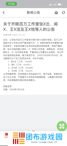 根据一份流传到网上的内部公告,1月24日,完美世界开除了百万工作室四人,其违规行为包括在素材制作外包管理方面玩忽职守,构成严重失职;利用公司资源、谋取利益,涉及金额巨大;内外相互串通,严重违反公司廉洁从业规定等,对张X云、闻X、王X洁、王X悦等四人进行解除劳动关系和永不录用的处理。