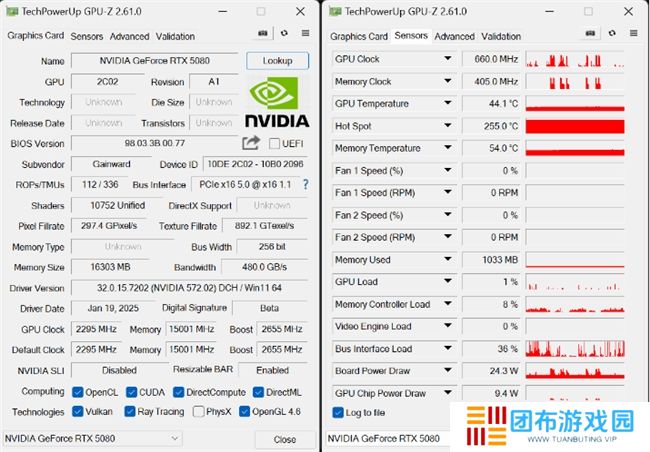 由检测软件GPU-Z可看到耕升 GeForce RTX 5080 炫光 OC更为具体的参数表现和实际规格。通过数据可以看到,在待机状态下,显卡温度为44.1℃,功耗为24.3W。