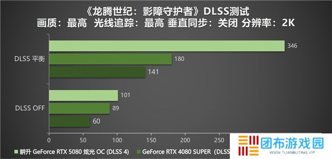 在2K分辨率下,《龙腾世纪:影障守护者》在最高画质、光线追踪开启、DLSS打开时,耕升 GeForce RTX 5080 炫光 OC更是能够达到346帧。耕升 GeForce RTX 5080 炫光 OC加上DLSS 4技术的加持,能够实现更加细腻的画面和超高帧率,有效减少了画面的撕裂和卡顿现像,如此优秀的性使得玩家可在高分辨率下享受一场场稳定且流畅的游戏体验。
