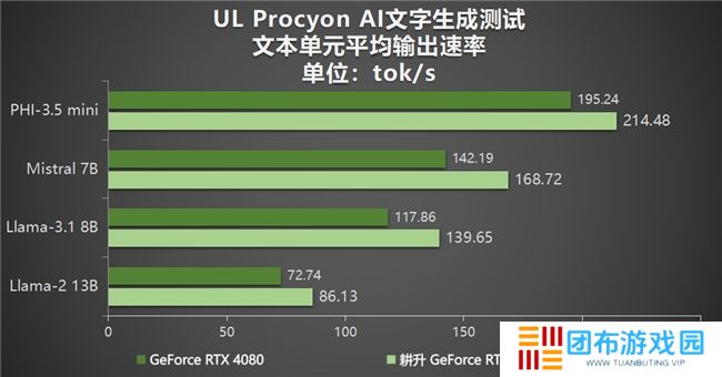 在UL Procyon AI的文字生成能力评估中,分别对PHI-3.5 mini、Mistral-7B、Llama-3.1 8B以及Llama-2 13B四种模型进行测试。UL Procyon平台将依托这些模型,执行一连串的AI计算任务,进而依据任务完成情况,对这些模型的文本单元平均输出速率表现进行评估,数值越高越优秀。