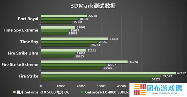 通过3D Mark软件的基准测试,可以发现耕升 GeForce RTX 5080 炫光 OC在各项指标上的分数,比GeForce RTX 4080 和GeForce RTX 4080 SUPER 均有很大提升。尤其是在Fire Strike测试中,耕升 GeForce RTX 5080 炫光 OC 的分数高达67112分,较GeForce RTX 4080 SUPER 和GeForce RTX 4080分别实现了13%和24%的增幅,彰显出其卓越的性能表现。