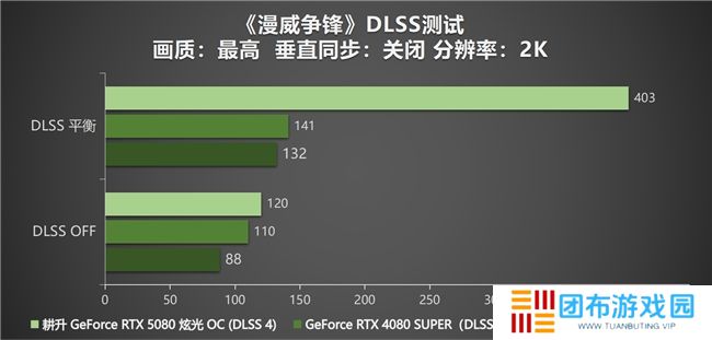 在2K分辨率的测试下,耕升 GeForce RTX 4080 SUPER和GeForce RTX 4080 在启用DLSS 3技术的情况下,游戏的帧数分别达到平均141帧和132帧的。而耕升 GeForce RTX 5080 炫光 OC在开启DLSS 4后的帧数达到了平均403帧,相较于前两代显卡有着超大幅度的性能提升,轻松地拉开了性能差距。