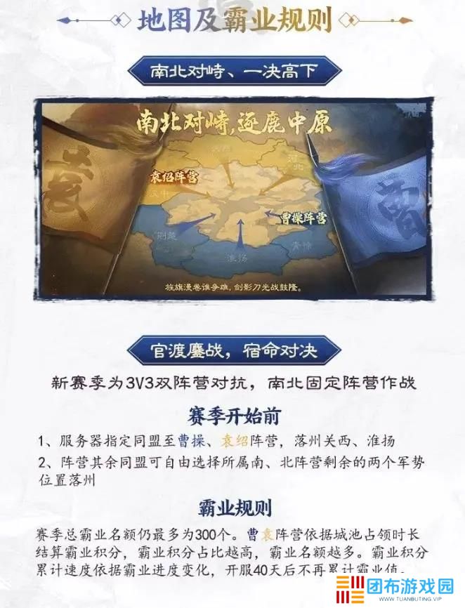 三国志战棋版PK5官渡之战赛季依旧延续3V3玩法,本次为南北对战,赛季开始前服务器指定同盟至曹操、袁绍阵营,落州关西、淮扬,阵营其余同盟可自由选择所属南、北阵营剩余的两个军势位置落州,其余规则大同小异。下面和本站小编一起来看看吧