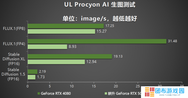 在常规的UL Procyon Stable Diffusion FP16测试中,特别是在处理Stable Diffusion XL模型上,耕升 GeForce RTX 5080追风平均12.94秒即可生成一张图像,比GeForce RTX 4080要快接近7秒,这一差距彰显出其卓越的性能表现。