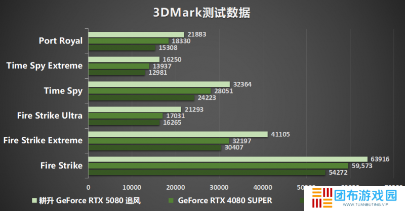 首先使用3D Mark软件对GPU进行基准测试。从测试结果上来看,耕升 GeForce RTX 5080 追风在多个数据指标上与GeForce RTX 4080 和GeForce RTX 4080 SUPER相比均有明显提升。其中在Fire Strike测试中,耕升 GeForce RTX 5080 追风的得分高达63916分,而在Port Royal测试中,其21883分的得分与GeForce RTX 4080 的15308分和GeForce RTX 4080 SUPER的18330分形成显著对比。总体而言,耕升 GeForce RTX 5080 追风在性能表现上相较于前代显卡有显著的提升,成功地拉大性能差距。由此可见,耕升 GeForce RTX 5080 追风拥有极为卓越的基础配置。