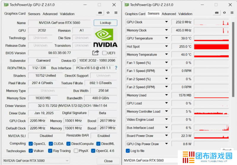 由检测软件GPU-Z可看到耕升 GeForce RTX 5080 追风更为具体的参数表现和实际规格。通过数据可以看到,在待机状态下,显卡温度为39.0℃,功耗为22.3W。