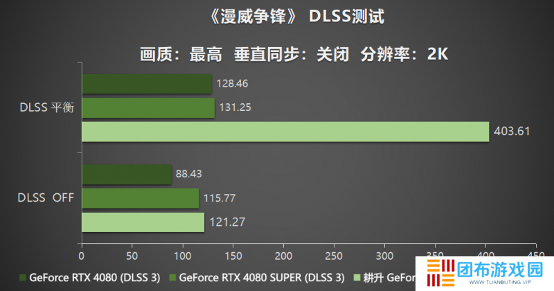 《漫威争锋》作为一款多人竞技游戏,更高的分辨率不仅能提升视觉效果,也能让玩家在激烈竞技中更加进准地捕捉到战场上的每一个变化,从而做出快速且准确的决策。通过测试可以看到,耕升 GeForce RTX 5080 追风开启DLSS 4后,在2K分辨率下可达到超过400帧的成绩,与前代显卡拉开了显著的差距。