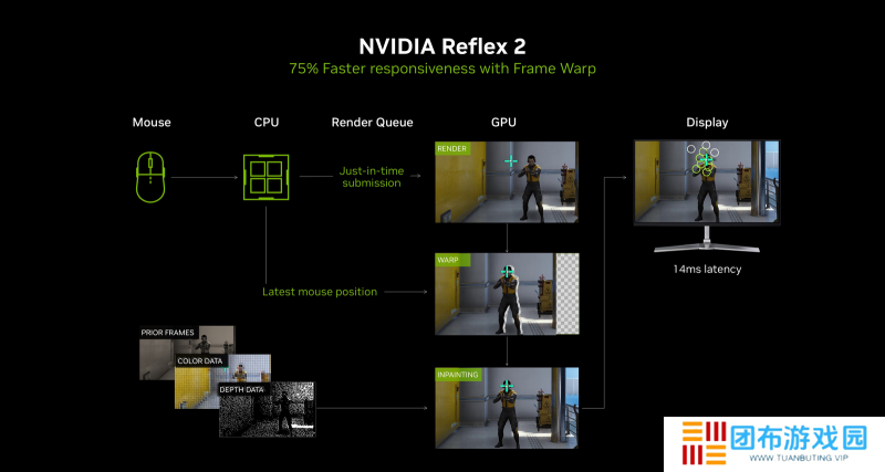 此外,全新NVIDIA Reflex 2技术还引入了Frame Warp技术,该技术可在渲染帧输出至显示器之前,依据实时捕捉的鼠标输入信号进行即时更新,降低游戏延迟,最高可降低 75% 。更低的延迟和更快的响应速度为玩家在FPS/TPS等游戏中带来出色的制胜优势。